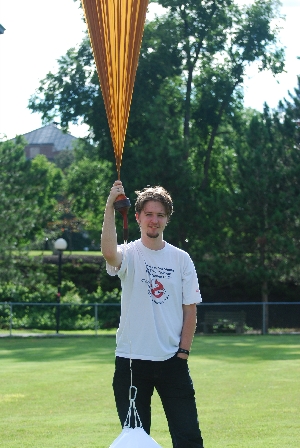 | The recovered craft! This is a quick view ofthe recovered craft. It landed in one piece, a bit dinged up but for something that fell from ~40,000 ft up, using a tablecloth, in excellent shape! | ![]() |