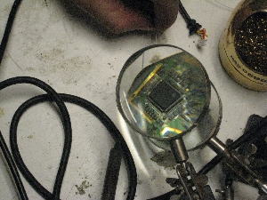 | USB/ RS232 GPS A bit more on the USB-GPS. Shown right is the smt IC in question, the onboard usb -> ttl Rs232 converter, which 2 tiny 30 gauge wires were tacked onto to allow for secondary communications in case the cpu went awry. | ||