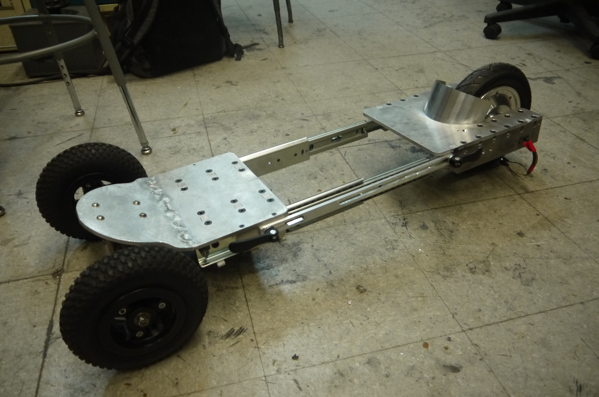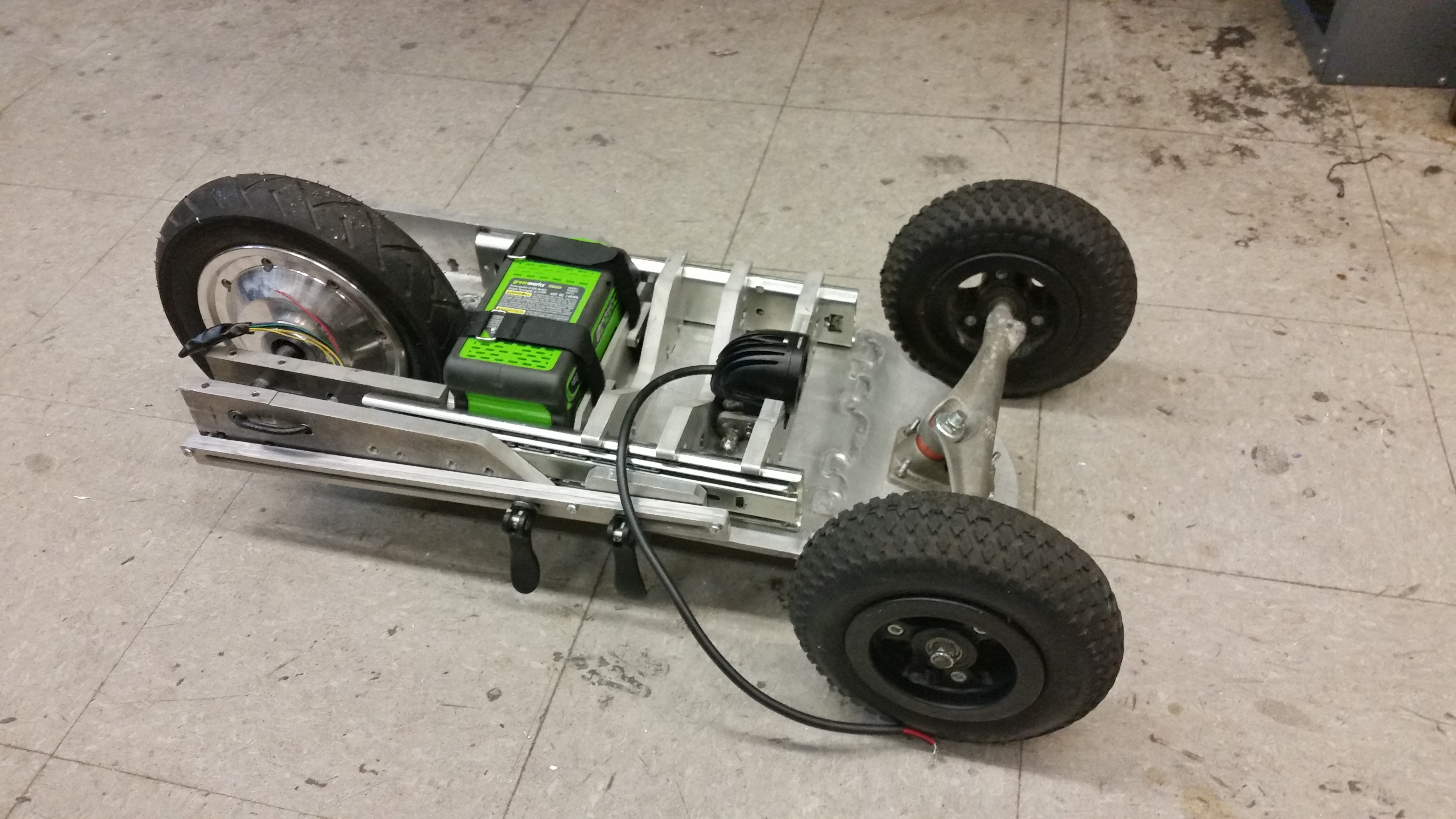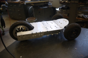 Video shot on a GO PRO Hero 2 CAD and PlottingThe host mountain board was a well used board with a flat tire. Mountain boards are really curious, they are intended for downhill or even more wild: being powered by kites. Using leg propulsion with a pneumatic tired board was fairly slow-going, the tires really absorb a lot of leg momentum. More curiously there are foot grabs but no external brake assembly. First Draft CadThe powered-fold-able skateboard plottings begin. My over-arching goal was to fit this thing in a normal checked bag, and be able to carry the whole thing on a plane. This model includes the front trucks from the host mountain board and a rough model of the hoverboard 10" hub-motor. CompressedShown is the skateboard shrunk down into the 'travel' state. Almost all of the electronics are housed inside the rear portion of the board, including the battery module, the motor controller the receiver and the on-board 48v to 12v dc/dc converter. The only electrical bit outside the back was the headlight, connected by a coiled expansion cable. CAD files available at the end of the writeup. As the trip was coming quickly (1.5 weeks away), I opted for a quick-fabrication topology of a waterjet. Moreover, instead of having to tap and drill multiple holes, a captured-square nut topology was used. On the front half of the drawer-sliders, three braces keep the larger portion of the drawer-sliders perpendicular to the foot plates. The front wheels require mounting at an angle. Instead of press-bending the aluminum, i opted for a simpler interleaving fingers welded in place. On the far side of the skateboard was the rear hub motor mount. As the hub motor is single supported (from a balance-board) two mounting points clamp it in place and couple the load into the rear foot plate. To prevent the whole assembly from collapsing into itself a slotted assembly was used with latches to hold it in place. Initially I used hand-tightening screws but they are fairly horrible in a vibration environment. Ben mentioned cam-locks and lo, they did the trick quite well! So overall the mountain board consists of 3 parts, the front steering pod including the headlight, the rear hub-motor motor controller assembly and finally the drawer-slides and position locks. Given that the front module requires power, a small coiled expansion wire (similar to a phone cable) is used. Electronics OverviewThe skateboard hardware platform was intentionally basic. A battery pack connects through a vibration capable circuit breaker into a motor controller (VESC) along with a 12v DC/DC converter for headlight operation. A 2.8 GHZ receiver mates to the VESC for throttle PPM and finally the VESC pumps out 3 phase AC per the position feedback from the hall effect sensors. A huge power zener (well above the minimum trigger voltage of the battery pack) is included here to prevent an over voltage condition. If the Circuit breaker trips under load, I didnt want regenerative current from the motor to ramp up and destroy the VESC. Assembly BeginsThe first weldment is the angle for the front truck mount. This is 6061 aluminum, 0.25" thick. DLAB tig to the rescue. I made small brackets to allow the clamped part to sit at a fixed angle. Tiny clamps were used to keep the small angle brackets in place. The same FRED that brought you mass destruction, joined in for welder party. After the welding was complete, I used a flap-disc to sand the weldment surface into a more reasonable state. Attaching the drawer-slide holstersShown is a loose fit for the drawer-slide holsters, these are just held in place by the cut-out notches for a rough fit. The bottom of the weld surface zig-zag is visible, there is a lot of weld contact area. While still verifying 'everything fit', here's the rear portion of the skateboard, A countersinking bit (90 deg) was used to keep the flathead screws recessed. Mounting the drawer-slidesThe flat head screws tied to the drawer-slides protruded out a bit too much and needed a bit of a countersinking. A portable drill with countersink bit was used to adjust the hole openings. Shown are the four M6 screws holding the opposing side of the drawer slide to the back portion of the skateboard. The skateboard starts coming togetherWith the front truck mounted, the whole thing started taking shape, It looks like the cad wasn't too far off. I missed the tap size of the M6 screws for the drawer-slide, so external nuts were temporarially used. Time for the rear wheelThe single-supported 'seg-thing' wheel is peculiar, I've got one mount point for the whole motor-tire assembly. The water jet part file contains an indent for the slotted bit of the wheel, and two parts that will bolt in from the top to torque down on the wheel assembly to keep it constrained to the board. Cleaning up the surfaceThe two parts intended to clamp down on the motor-wheel assembly needed a bit of touch up, there is some taper left over from the waterjet process, a quick pass on the milling machine removes the taper. Using a couple c-clamps to test fitting, it started to look more and more like an actual skateboard. Test Fit TimeI marked the front facing side just for simplicity on the mill and then used a center drill, indicated off of the waterjet notches. This allowed for easy center positioning. I then used a tap-drill for an M6 to bore all the way through both parts while they were heavily clamped in the vice. A clearance drill was then used seperatley on the non-clamping part of the rear wheel holder assembly. An M6 Tap was used on the lower clamping portion of the wheel holster assembly. During the design phase I left in an M6 Square nut holster in the case that the rear assembly needed a different mounting. The change here actually worked out quite well, the two M6 Screws are tightened from the top of the skateboard without extra hardware. ITS BECOMING A REAL BOARDWith minimal machining a skateboard appears! Shown is the collapsed and extended state. Note