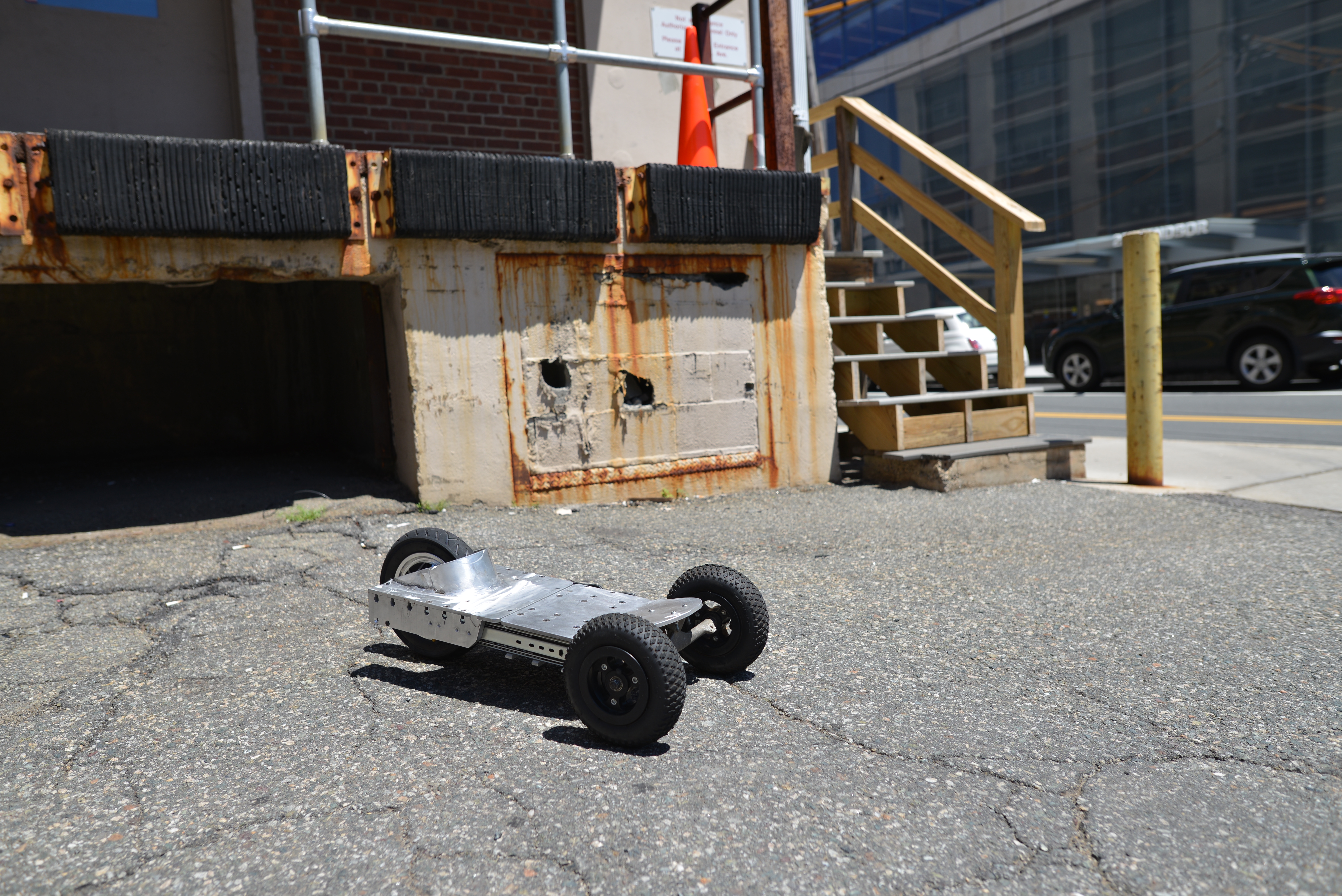 This project started with an upcoming overseas trip. I wanted contraption that I could bring aboard a plane, legally, and ride about a reasonable distance. I was limited to what the FAA allowed, the size constraints of a normal checked bag and what would reasonably pass thru the TSA into / out of the states. To achieve this I used mega-drawer-slides a hub motor and off the shelf Lithium lawn maintenance battery packs. Shown below are the two states of the planned skateboard, collapsed and at full extension. CAM-actuated levers are used to lock the setup into place. The video above is a clip of running through Cambridge MA on an electric collapse-able mountain board. Shown is rough asphalt (Normal, poorly maintained Massachusetts roads and sidewalks) along with some gravel and dirt paths alongside an MBTA line. It holds up quite well. The VESC is set to 30A max and the pack is 40V nominal (10S Lithium Ion).