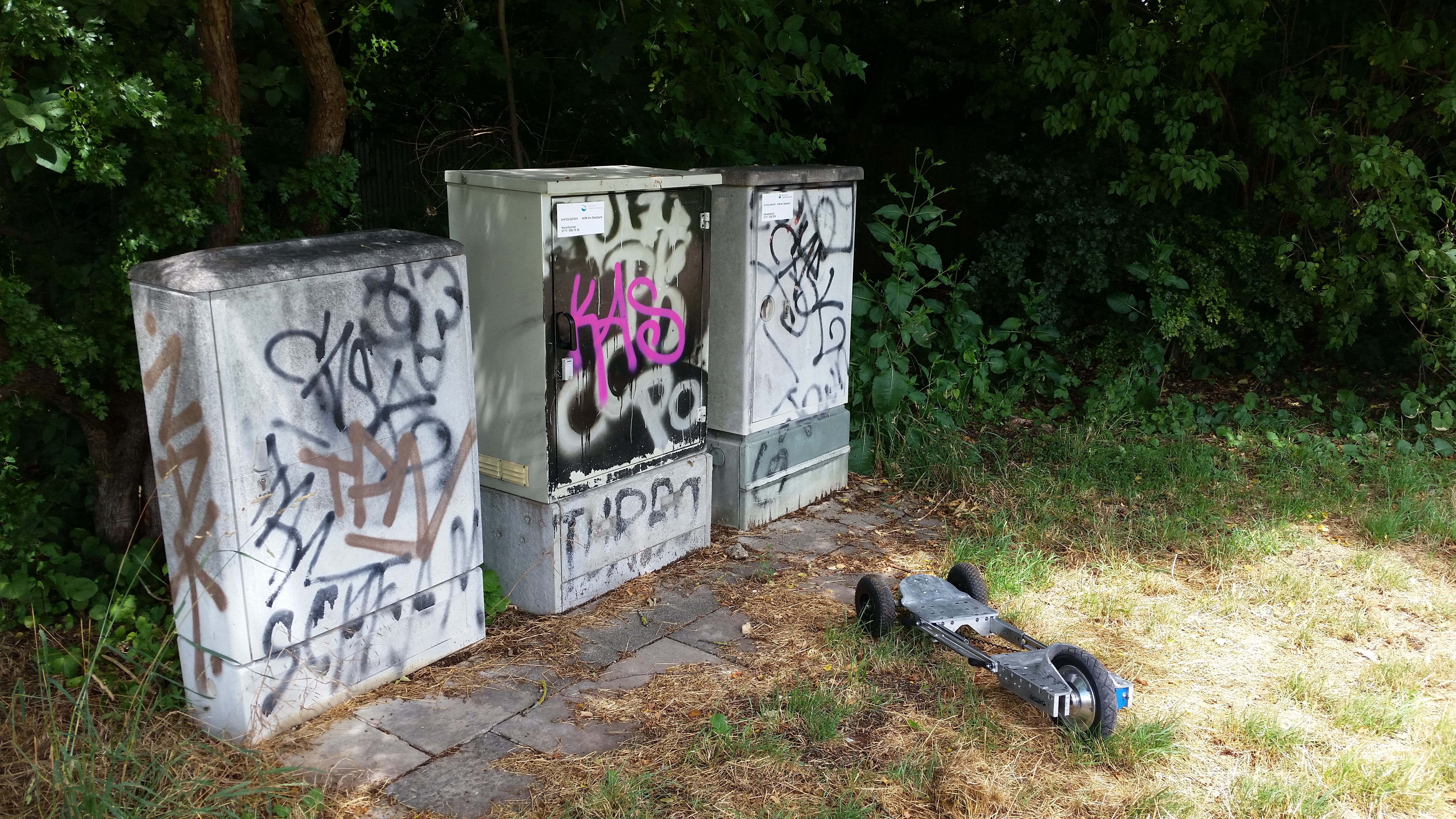 My first 'I'm out of joules' moment happened at one of these small public paths. I snooped around for outlets and found a convenient one hiding in an information? cabin. QUITE EXCELLENT TIMING. Unfortunately all four external outlets were disconnected :/ EDUROAM?So at the time I did not have access to the internet on my phone, nor cell coverage. While hiking around with a 24 lb aluminum contraption, my phone buzzed with a new email. I was A BIT PERPLEXED. As it turned out I was near an educational institution that had eduroam implemented. I walked over, was greeted by a German DLAB-Jack doppleganger, found an outlet and sat in a lobby, with my skateboard battery and charger hiding next to a fire extinguisher. ~1h to fully recharge... Yaay EspressoI spent the next 10 minutes catching up on emails, and then spoke with the nice folks at the campus coffee shop. I had some potent espresso while waiting for a skateboard to recharge, all in a country that I didn't speak a bit of the language in. Quite good. I contemplated my range estimations and figured out why I was coming up short. The 2AH pack was 10S1P 18650, and I was pulling something like ~20 amps while accelerating. The cell impedance was starting to add up, and I was fairly heavily abusing the pack. Continuing that logic, the 4AH version of this pack should have more than double the range of the 2AH pack, as the pack impedance should be lower. I also made some observations, a proper 'strap' that somehow lived in the board but could come out for carrying it about would be great. After some european electrons I had an epiphany, what if i had the option of buying an extended pack nearby? I used the collegiate WiFi waves to hunt down the location of a hobby store. 2 Miles, not bad. With helmet and cell phone map, I zoomed off into the ether. It was a very nice shop, but geared more towards smaller things. I asked about LIPOS and pointed at the skateboard, I asked if he had any 5-S packs, but unfortunately there were only a few tiny 3S packs in stock. I borrowed some electrons for a while and continued on to a nearby park path. Have I mentioned that this place is beautiful?The 'random path through the woods' doesn't really happen in the states, at least not to the same extent. Both of these looked fairly heavily worn by bicycles, and keeping the rear-motor-wheel centered on the dirt patch worked well for traction. There's sufficient clearance on the board presently for it to handle dense grass and a reasonable trail. This worked out way better than I expected. Not before long I was again hunting for juice. These were hiding out in a field, but unfortunately locked. Fairly certain two were telecom, fortunately one had a service port with (measured) ~230 vac (thanks backpack-multimeter). After some adapter-ing I was back to acquiring joules and watching nature, sitting on a skateboard. Rivers and trailsThere was a brook running thru nearby, and for the sake of 'its wicked hot' I splashed about in it. Shortly after I headed back to get my battery and charger. Really wish I brought a higher capacity charger, lessons learned. Following the water back to the townI followed some muddy grass paths and the water back to town chewing through the remnants of my recently acquired electrons. The gravel and soft grass totally helped chew through electrons effectively :P I hiked to a nearby tennis court and acquired some more electrons. By the 3rd recharge cycle I was starting to really kick myself for not bringing a higher capacity charger I recently built. I started thinking about what this trip would have been like pre-flight restrictions. A couple 160 wh batteries and a 320w charger would have really extended the amount of land I could've explored, but given the amount of free-time I had it worked out well. Skateboard ParkIn my wanderings back to home base, I ran across a skate park. Nestled away off a side road. And I learned of this magic thing called ground clearance I will make a note, I have no prior experience at a skate-park or, for that matter the coordination required to use one. I slowly worked up the nerve to go faster around the fishbowl part and on the raised area afterwards, the led bulb got smashed. It ripped off the tack-welds holding it in place and lo, it remained e-taped on for the rest of the adventure. Tire wear and replacementAfter about 40 miles of skateboarding, the front wheels really started to show their wear. These were the stock tires that appeared with the skateboard itself, I was surprised how quickly they were shredded by riding on asphalt and gravel. I ordered two replacement wheels [link] as having a front tire blow out wouldn't be that much fun. I really like this split-hub design. I was a bit curious as to how much of a bother replacing the tire on the skateboard would be, ranging from prying at the rims, screwdrivers and the like. Fortunately it was just three allen-key screws and hex head nuts. After a quick deflating of the tubes and unscrewing the whole tire came apart. The swapping was rather quick. I've seen split hub designs before, and the stout reinforced injection moulded part was well designed, in comparison to the punched tin harbor-freight variants. Inflating the tire and assembling was very straightforward. The only intracy was ensuring that the tire tube did not get clamped between the split hub assembly. Range Testing2AH pack discharge testI opted for long-straight-unhilly roads for the first range test. Vassar street near MIT was a good choice, bike lanes on both sides and quite long. I completed a few loops, with the headlight on (10w extra loading should be a nominal difference in range). The test conditions were pretty ideal, warm-ish evening (90F), not too much wind, fully inflated tires and fully charged battery. To Record the trip data I used the android app 'GEO TRACKER'. Its really reliable and the data format is useful. Cant recommend it enough. The ride clocked in 2.99 miles, and given th